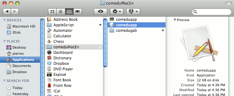 The “Applications” folder now contains “comeduMacEn” in which the application's name is “comeduapp”.