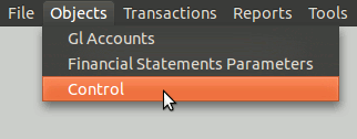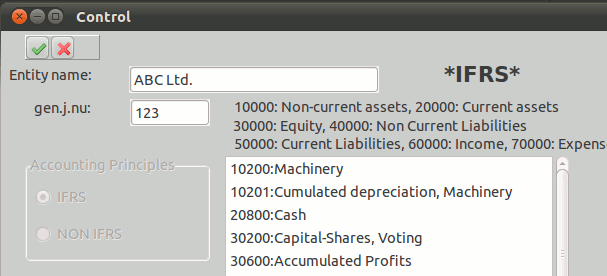 The two modifiable parameters are the name of the entity and the general journal number of the last transaction in the database. The list of ledger accounts is read-only and can be changed by the object “GL Accounts” described in the next section.