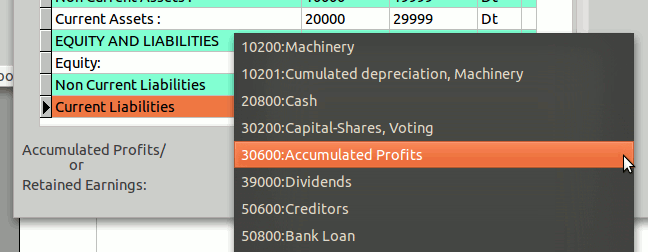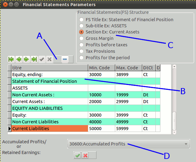 A section of the financial statement, such as “Current Assets” must have a minimum code, a maximum code and a “DtCt” input which informs whether the section is a debit(Dt) or credit (Ct) section.