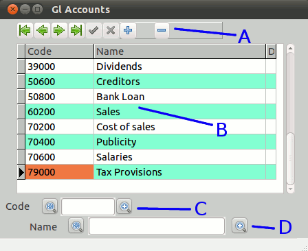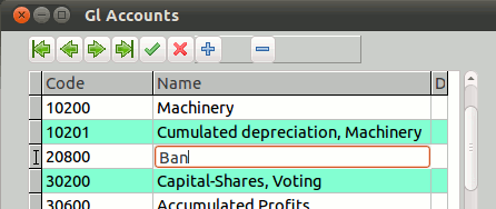 To delete an account, position the grid on the appropriate row and click the “Delete (Minus)” button.