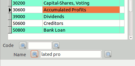To search for a name enter the name or partial name in the Name field and click on the magnifying glass with a dot to find the name that contains what you need. For example, if you are looking for “lated pro”, the search will find the account “30600: Accumulated Profits,” which contains “lated pro”.