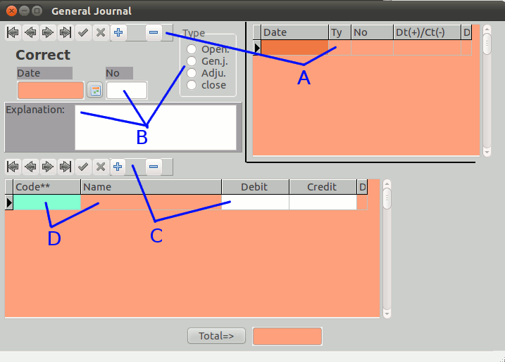 The calculation of total debits and credits is automatic. It is very important to type the “Tab” key, when entering a debit or credit to move to the next column. The software validates the number and calculates the total debits and credits. If you jump to another row with your mouse without touching “Tab”, it is possible that the calculations will not be done.