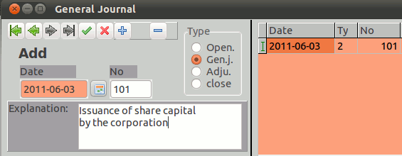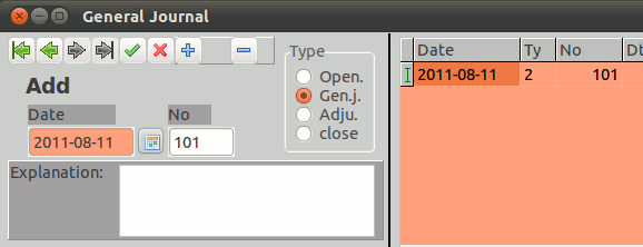 In the case of an addition, the software inserts the present date or the date of the last transaction that was entered “2011-08-11” and the next general journal number “101” which is automatically generated by the “Control” form.