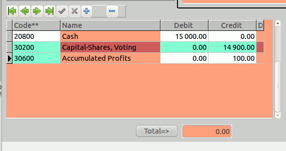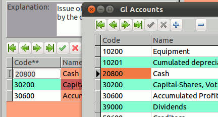 Code**: Code of the ledger account. The double stars “**” indicates that a double click shows the GL accounts form.